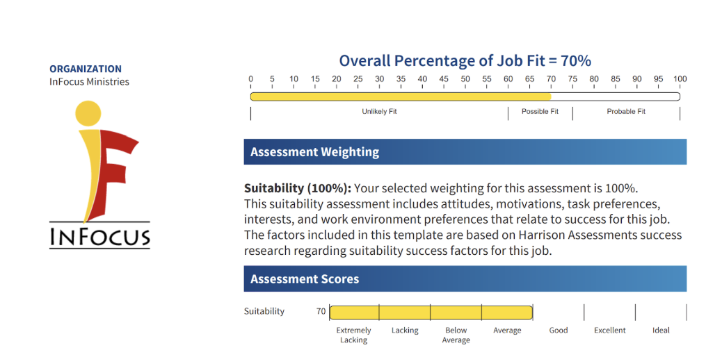 When Kim took the Harrison within the last year, her initial Composite Score landed her as a “Possible Fit” with a score of 70%.